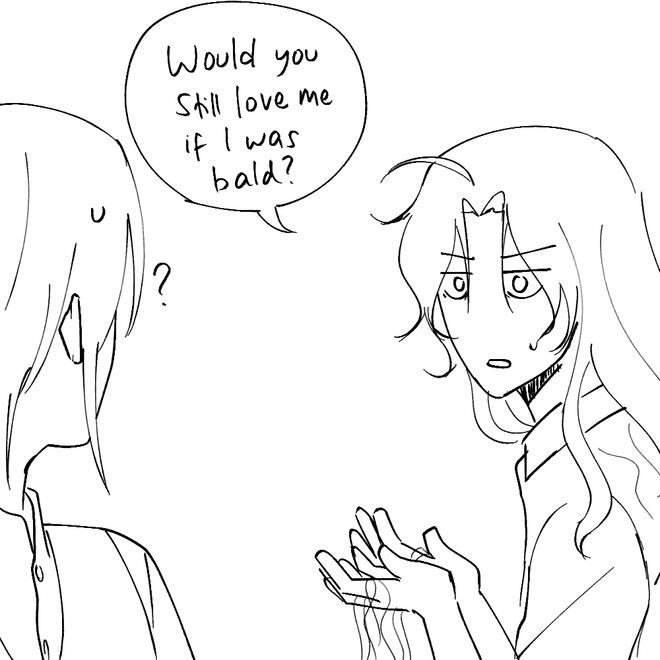 e.g.: "can you draw Sherlock asking Liam 'would you still love me if I was bald' pls"